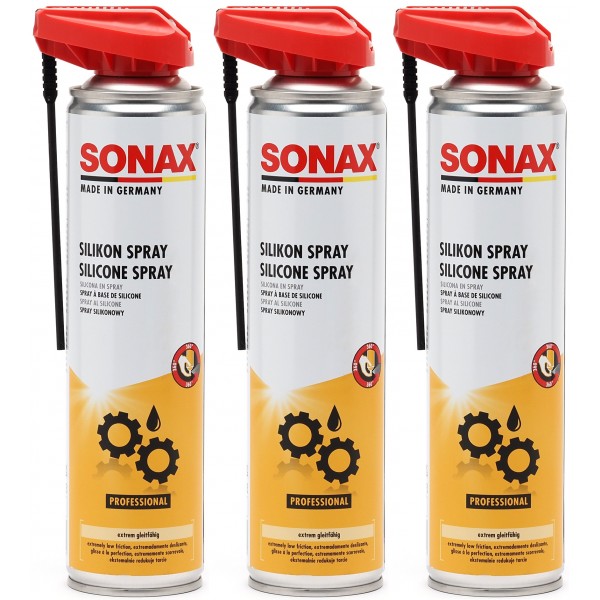SONAX SilikonSpray schmiert, pflegt und schützt langanhaltend Gummi-, Kunststoff-, Holz- und Metallteile.