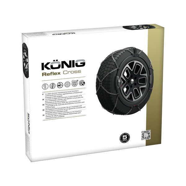 Der Reflex Cross verfügt über das Crossover-spezifische Diamantdesign, das aus flachen Gliedern und einem dreifach geschweißten Stegsystem in der Mitte der Reifenlauffläche besteht. Dieses spezielle Design sorgt für zusätzliche Grabkraft und allgemeine Traktion beim Fahren auf verschneiten oder vereisten Oberflächen. Im Vergleich zu Standardquerschnitten mit 9 mm bietet das König Reflex Cross-Profil 15 % mehr Traktion und +20 % Widerstandsfähigkeit gegenüber Belastungen.